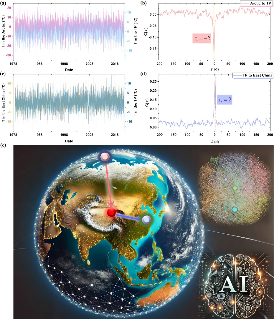 图2. 复杂地球系统圈层相互作用的气候网络分析。子图 (e) 的原始图像是由人工智能ChatGPT生成。