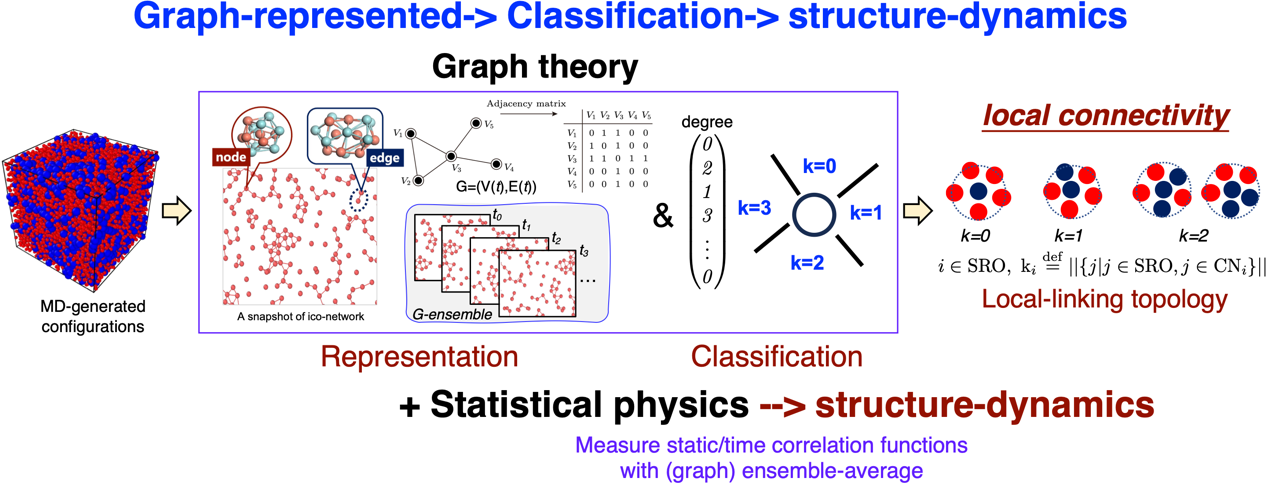 图1. 无序系统结构图表示示意图。这里关注的并非是静态拓扑图上的动力学过程,而是反映实际液体结构演化特征的、基于集合平均的物理动力学行为。在本无码自慰 中所采用的图为无向无权图,节点的度为其邻接节点的数量。