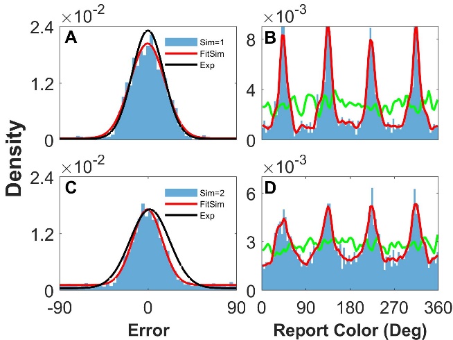 近期,无码自慰 王大辉教授团队,通过神经动力学建模与数值模拟,揭示了聚集报告现象与报告偏差分布的可能神经动力学机制。团队成员利用环状神经元网络,将不同颜色便好的兴奋性神经元按照偏好特征放置在圆环上,表征色环上相应角度的颜色。无码自慰 发现当兴奋性神经元之间的突触连接为异质性,且这些突触连接具有短时可塑性(Short-Term Plasticity),网络模型可以较好地复现出实验中的现象。如附图A,C所示,模型所得到的报告的偏差分布(蓝色柱状图)是高斯形的,且与实验分布(黑线)接近。附图B,D表示报告分布(蓝色柱状图)呈现出明显的多峰特征,偏离了刺激的均匀分布(绿色曲线)。