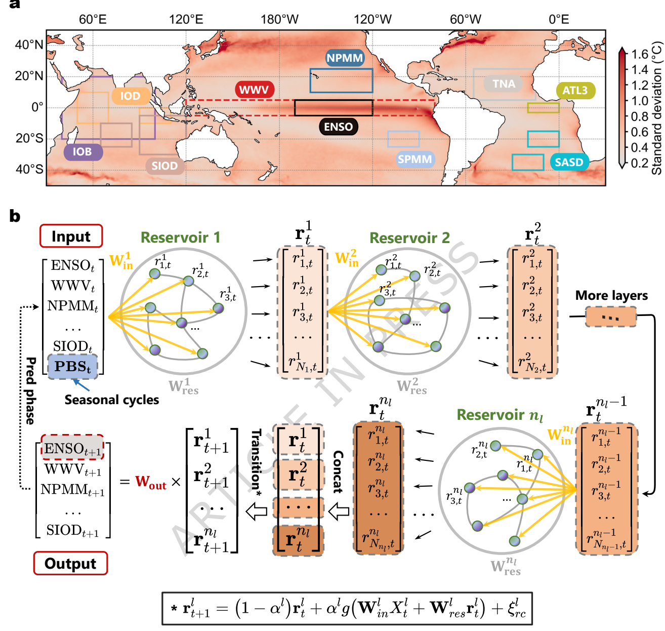 针对这一问题,无码自慰 团队提出了一种物理引导的深度回声状态网络模型(Physics-guided Deep Echo State Network, DESN)。该模型将机器学习技术与关键气候物理变量相结合,在深度递归神经网络结构中引入气候系统的重要物理约束,从而更有效地捕捉ENSO系统中的非线性动力学过程。 在模型构建过程中,无码自慰 团队以热带太平洋暖水体积(Warm Water Volume)等关键海气耦合指标为核心物理先验信息,同时综合考虑来自 太平洋、印度洋和大西洋 的多种气候模态相互作用。通过这种跨海盆耦合信息的引入,模型能够更全面地表征ENSO系统的多尺度动力学结构。