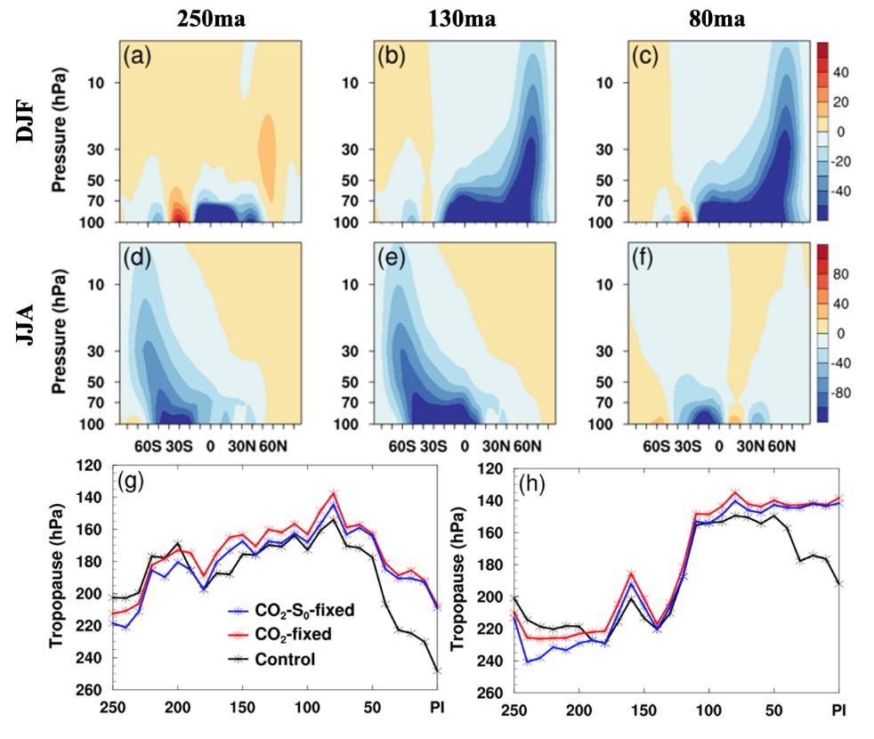 图2 (a)-(f)不同时期相对于工业革命前(PI)的剩余流函数异常以及(g)-(h)2.5亿年以来对流层顶高度的演变