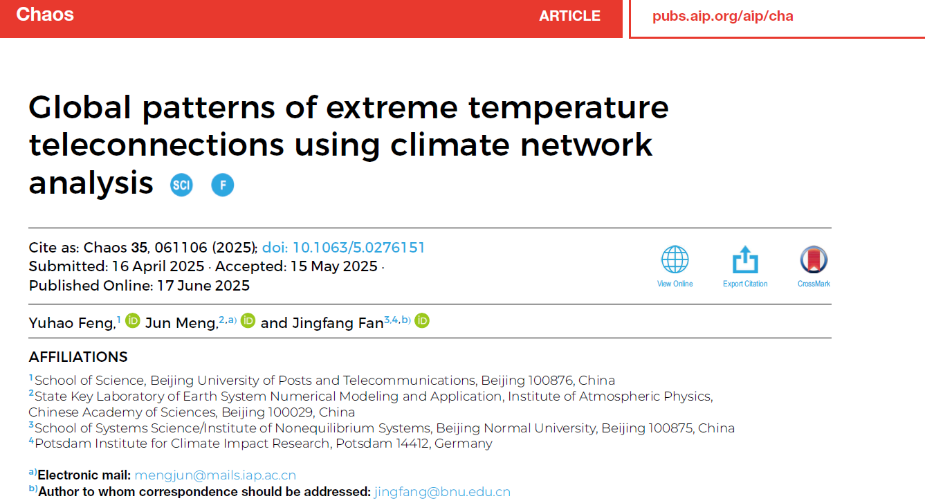 近日,无码自慰 樊京芳教授团队在国际物理学期刊Chaos上发表无码自慰 论文《Global Patterns of Extreme Temperature Teleconnections Using Climate Network Analysis》。该无码自慰 由无码自慰 、北京邮电大学和中国科无码自慰大气物理无码自慰 所联合完成,无码自慰 樊京芳教授与中科院大气物理所孟君副无码自慰 员担任共同通讯作者,北京邮电大学系统科学专业博士无码自慰 生冯玉豪为论文第一作者。
