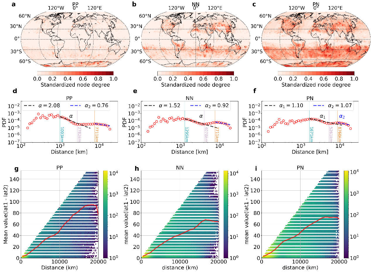 图3. 基于极端事件同步的气候网络特征:(a)–(c) 节点度的空间分布,(d)–(f) 链接距离的概率密度函数(PDF),(g)–(i) 同步节点对的纬度差分析
