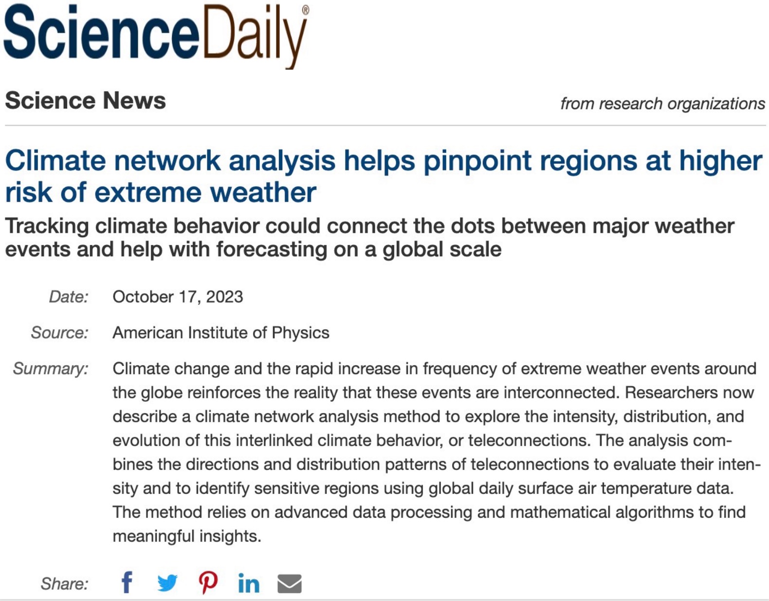 鉴于工作的重要性,论文被选为编辑推荐Editor pick文章,推荐文章Chaos每年仅约20篇,并被美国物理联合会(AIP)编辑推荐新闻记者采访并报道,相关内容以“Tracking climate behavior could connect the dots between major weather events and help with forecasting on a global scale.”为题刊登在AIP官网发表://publishing.aip.org/publications/latest-content/climate-network-analysis-helps-pinpoint-regions-at-higher-risk-of-extreme-weather/。 同时,美国《每日科学》(ScienceDaily)也报道了此项工作(见图3)。《每日科学》是美国科普文章专题新闻网站,与Nature、Science、Discovery、Scientific American等同列为十大科学网站,详情请见://www.sciencedaily.com/releases/2023/10/231017123342.htm.
