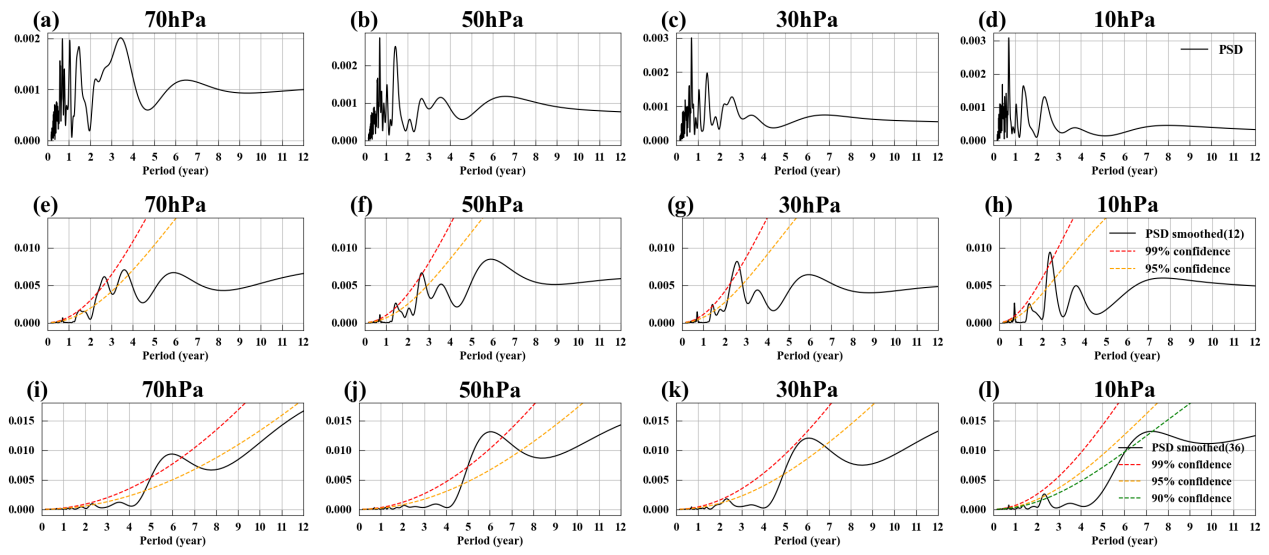 图 3 南极极涡模态时间演化的功率谱密度及其显著性。第一行为70~10 hPa原始的功率谱密度,第二行为12个月平滑后的功率谱密度,第三行为36个月平滑后的功率谱密度。
