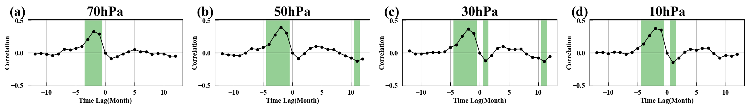 图 4 第四模态与南极极涡模态的超前滞后相关图。(a)-(d)分别表示70,50,30,10 hPa,Time Lag<0 表示第四模态超前南极极涡模态。绿色阴影区域表示p<0.01。