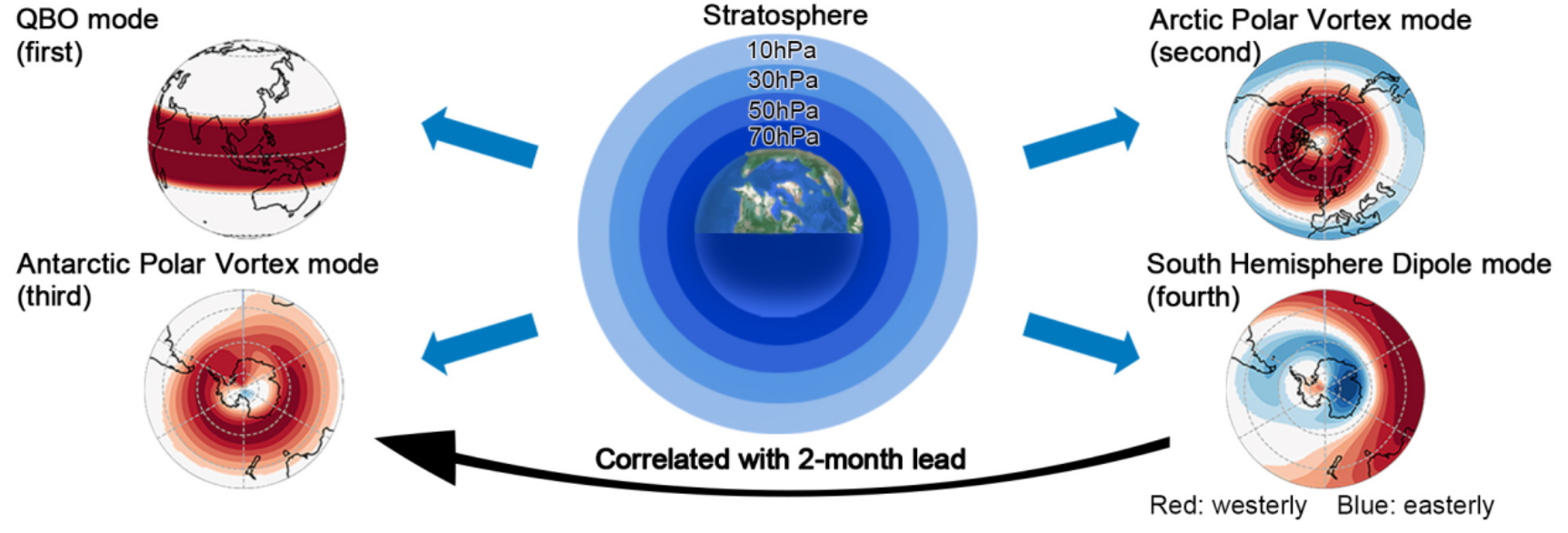 平流层作为地球大气的子系统,其演化受大气动力过程与化学过程的双重调控,其中波动及其与平均流的相互作用尤为关键。这些波动尺度跨度极大,从小尺度重力波延伸至全球尺度行星波,本质上是一个复杂系统。著名物理学家菲利普·安德森"多则异"(More is Different)的论断,生动诠释了复杂系统的涌现特性——当系统规模与复杂度达到一定程度时,会涌现出无法通过组分行为简单外推的新特性。理解这类涌现行为需要基础无码自慰 支撑,因此探究平流层作为复杂系统所呈现的大尺度气候模态与解析其控制动力学具有同等重要的科学意义。 2025年3月,无码自慰 陈晓松教授团队在《Entropy》杂志上发表了一项题目为《A Revisit of Large-Scale Patterns in Middle Stratospheric Circulation Variations》无码自慰 成果。该无码自慰 通过本征微观态方法(Eigen Microstate Approach, EMA)方法,系统揭示了平流层中层大气环流的主要变化模态和大尺度运动规律。这对理解平流层复杂系统的大尺度运动提供了新的视角,具有重要的科学意义和应用价值。