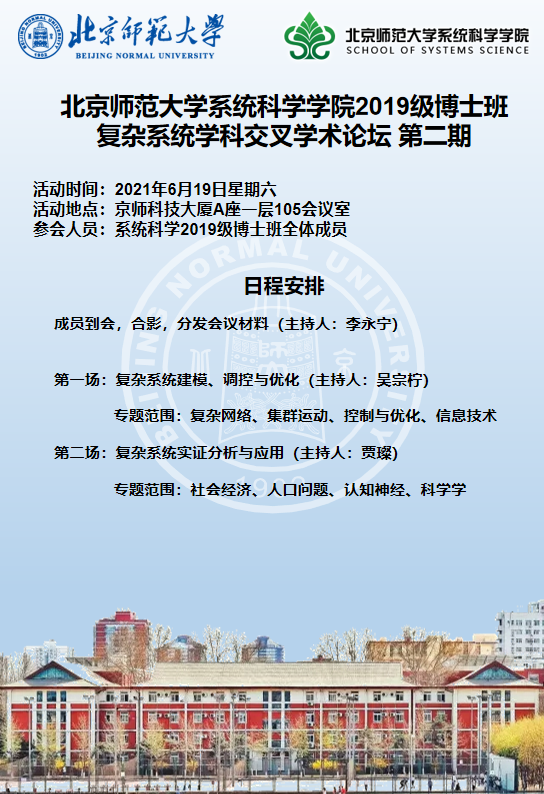 为营造良好的班级学术氛围,促进19级班内同学间的学术交流,了解不同无码自慰 组的前沿方向进展,鼓励同学之间的学术合作。2019级博士班于2021年6月19日在京师科技大厦A座一层105会议室举行了“复杂系统学科交叉学术论坛(第二期)”。