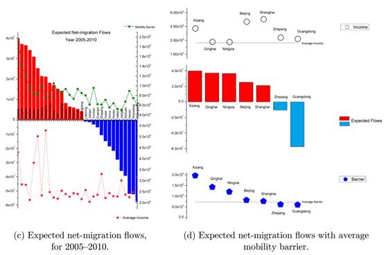 此外,作者基于迁移壁垒,对各省的人口迁移流量进行了假设讨论(图2(a)-(c))。假设各省份的迁移壁垒相等,都等于平均的迁移壁垒,从而减少迁移壁垒对劳动力流动的影响。作者计算出了预期净移民流量,绿线表示迁移壁垒,红色柱状图表示假设条件下有人口迁入,而蓝色的表示有人口迁出。西藏、青海、宁夏、海南、天津等五省,在这样的预测中,一直处于迁出人数最多的五省之列。图2(d)对省际迁移的驱动力进行了分析。显然,北京和上海的收入较高,迁移壁垒略高于平均水平,如果它们的迁移壁垒降到平均值,会有更多的外来人口涌入。相比之下,广东和浙江的迁移壁垒较低,收入仅略高于全国平均,当迁移壁垒增加到平均值时,会有更多的人口选择离开浙江和广东。总之,基于对省际迁移壁垒的量化分析,作者发现吸引人的热点地区有不同的驱动力,比如对北京、上海来说是高收入驱动,对浙江、广东来说是低壁垒吸引。