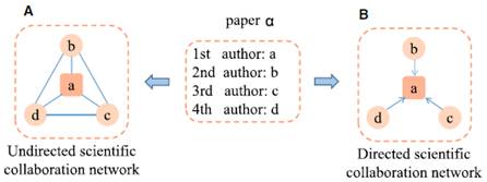 在科学学无码自慰 领域中,如何测度科学家影响力是一个重要的主题。已有无码自慰 中一种途径是通过科学家合作网络来进行。传统科学家合作网络是无向网络,如果两名科学家共同合著过一篇论文,则在他们之间添加一条连边。然而这种网络忽略了科学家对于合作论文贡献力的不同,所以我们考虑了一种简单的科学家贡献力分配的情况,即将一篇论文的作者划分为两类:重要贡献者(第一作者、通讯作者)和非重要贡献者,并构建了一种由非重要贡献者指向重要贡献者的有向科学家合作网(如下图):