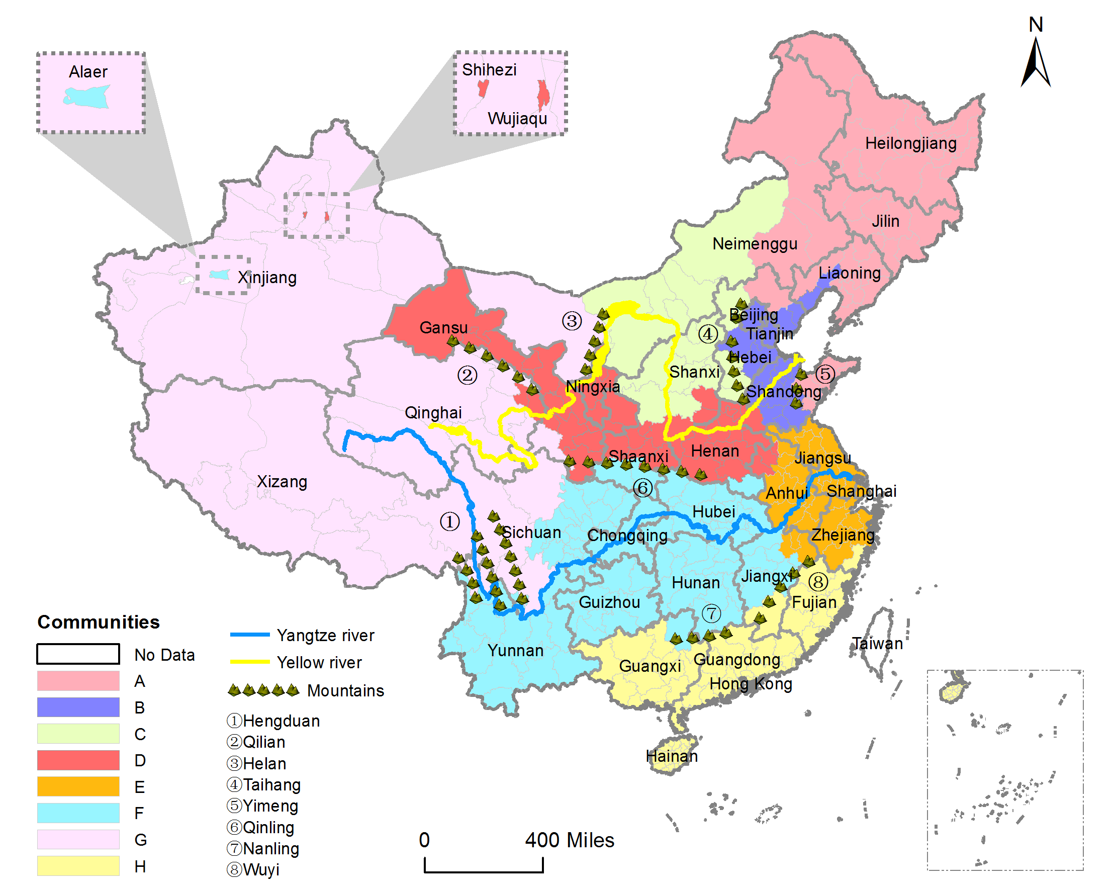 4) 一些重要的山脉往往分布在两个社团分界处,如:横断山脉、祁连山、贺兰山、太行山、沂蒙山、秦岭、南岭、武夷山等。山脉阻碍了两侧地区人口的相互往来,长期各自的演化使得它们的姓氏结构差异很大。