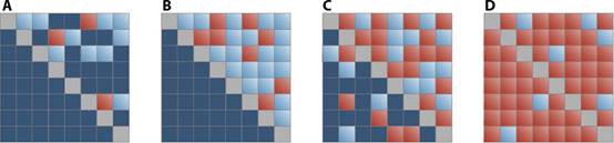 , all existent dynamical driving is net driving; that is, subsystems present a highly hierarchical structure. In this scenario, if a subsystem dominates another one, the former is not dominated by the latter. This is well illustrated in (A) and (B). Note, however, that only a few subsystems play an active (dynamical) role in (A),whereas the situation has reached a perfectly hierarchical structure in (B). Indeed, in this idealized situation, the net transfer entropy reaches its maximum: any further addition in terms of dynamical driving will decrease the amount of net transfer entropy [as in (C)]. Furthermore, (B) and (C) illustrate that there exists a tipping point beyond which the event has necessarily gone global. The extreme case where every subsystem exerts some amount of dynamical driving results in a “null driving” scenario [as in (D)]. In this schematic representation, the color scales go from dark blue to red, that is, zero to maximum transfer entropy, respectively.