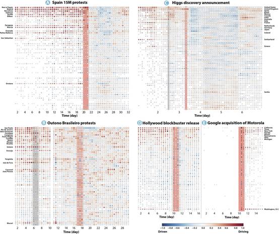 (that is, driven locations) and the latter corresponding to positive information flow balances (that is, drivers). The size of the circles is log-proportional to the number of messages sent from the location at that time, and the vertical bars mark the day of the main event. The geographical locations are ordered according to population size, except for (C), in which countries are ranked with the amount of Higgs-related tweets produced.