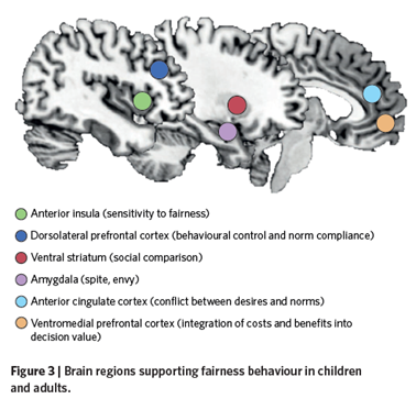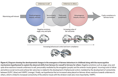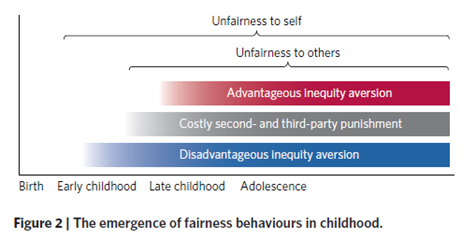 Abstract: New behavioural and neuroscientific evidence on the development of fairness behaviours demonstrates that the signatures of human fairness can be traced into childhood. Children make sacrifices for fairness (1) when they have less than others, (2) when others have been unfair and (3) when they have more than others. The latter two responses mark a critical departure from what is observed in other species because they enable fairness to be upheld even when doing so goes against self-interest. This new work can be fruitfully combined with insights from cognitive neuroscience to understand the mechanisms of developmental change.