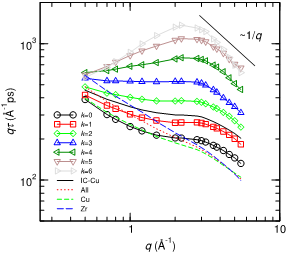 如图所示,在不同的波矢q所定义的空间尺度内,具有不同局域连接度的粒子表现出特异的输运性质。这些奇异的输运行为都可以跟某种特定的原子结构直接关联,它们本身特征的动力学与它们周围的介质相互作用、相互影响,造就了其特殊的输运方式。