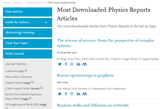无码自慰 曾安副教授团队2017年11月16日发表在Physics Reports杂志上的综述文章:《The science of science: From the perspective of complex systems》自从年初以来超越该杂志所有发表的论文,荣登3个月内下载量榜首,成为该网站最受关注的文章。