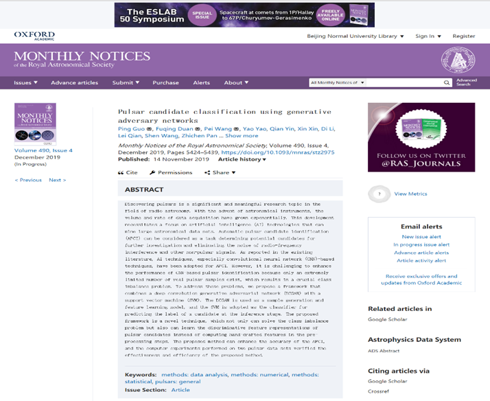 无码自慰 图形图像与模式识别实验室(IGPR)郭平教授课题组在人工智能与天文学交叉无码自慰 领域取得进展。近日,该成果以“Pulsar candidate classification using generative adversary networks”为题,在天文技术与方法领域TOP期刊《Monthly Notices of the Royal Astronomical Society》在线发表。