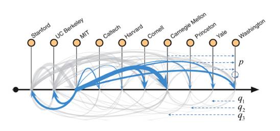 大学排名,兼有可靠性、简单性和客观性的特点。文章从极大似然估计的思想出发,推导出加权最小反向排名的模型。如下图所示,模型主要假设不同等级学校之间的博士毕业生跳转具有不同的概率,特别是由差的学校向好的学校跳转的会比较小,而且层级差别越大概率越小。
