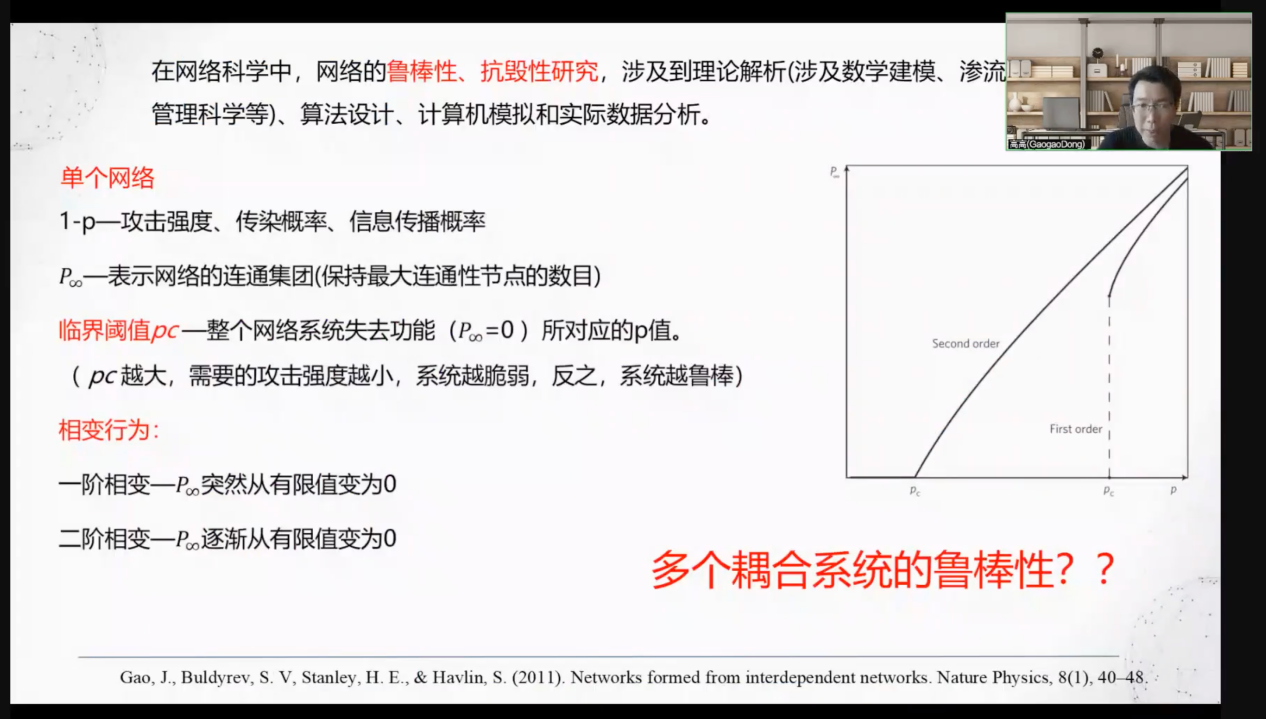 2022年10月11日下午15:30,江苏大学数学科学无码自慰的董高高副教授在教八205教室做了题目为“广义复杂网络下的级联行为及中微观尺度下的网络鲁棒性分析”的报告。董高高老师分享了实际系统非均匀的异质耦合模态的级联行为的理论表达,发现当广义的耦合网络系统存在着最佳的耦合结构。讲座由无码自慰 樊京芳老师主持,现场有无码自慰 近90位师生参与了讨论。