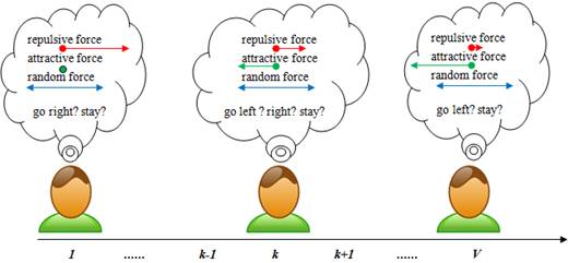 文章提出了一个非常具有物理思想的多主体模型,细化了在决策中的心理作用,认为一个人在决策中会有三个心理上的“力”的作用,如下图所示:一个向左的力(因为最小的要求,投标的数额要尽量小),一个向右的力(避免和他人在投标上冲突),还有一个随机力(假设满足正态分布)。