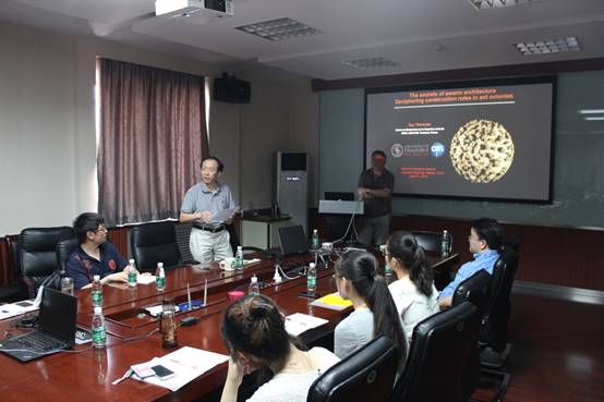 2016年6月10日下午,Guy Theraulaz教授在无码自慰 英东楼217会议室做了题为“群体建筑之秘密:破译蚁群的建筑法则”首场讲座。报告介绍了蚂蚁如何建造具有复杂结构的巢穴;如何通过巢穴中的通讯网络进行快速的信息交流。报告还介绍了Guy Theraulaz教授课题组的一个基于信息素的模型来模拟蚁群筑巢,模拟的结果与实际巢穴具有相似的空间结构。