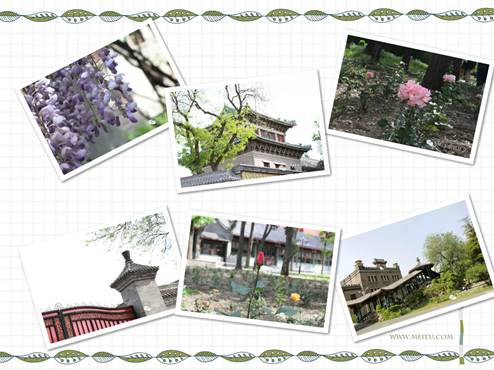 辅仁的校园内,安静祥和,一道红柱绿檐,设计精美的南北走廊连接教学楼、办公室、假山等各处的风景和建筑。走廊两边是如茵的绿草和怒放的鲜花,花草繁盛,仿佛像在欢迎前来参观的众人,使人不由得置身其中,亲近自然。教学楼的背面是一处假山,山上有清泉直泻而下,落在一个清可见底的水池中。水池不深,底面布满了鹅卵石,还有一群金鱼在追逐嬉戏,争先抢食,可爱极了。